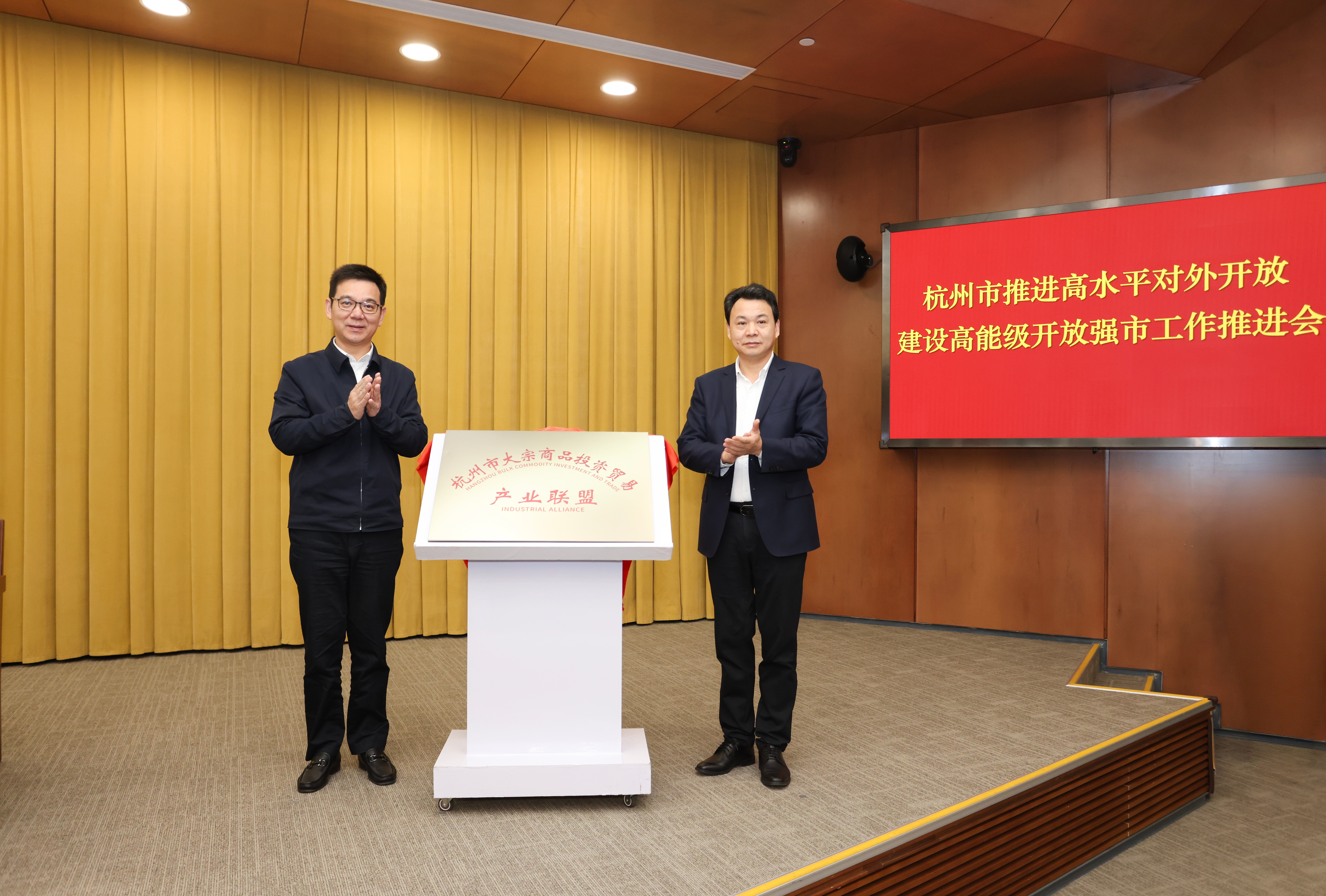 会议现场,杭州市大宗商品投资贸易产业联盟(以下简称“产业联盟”)正式揭牌,杭州市委常委、副市长章登峰,爱体育·(中国)官方网站党委书记、董事长钮健参与揭牌仪式。